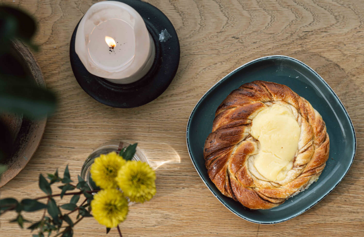 Hvetebolle, fylt med eggekrem og mandelmasse.