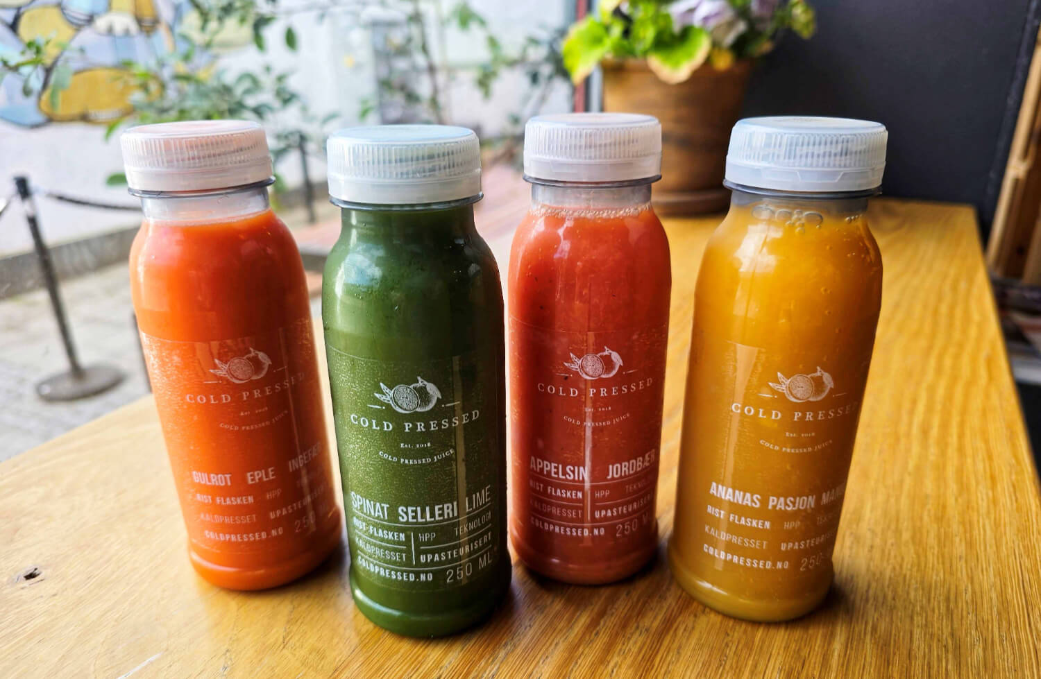 Kaldpresset frisk juice fra Cold Pressed i fire varianter.
